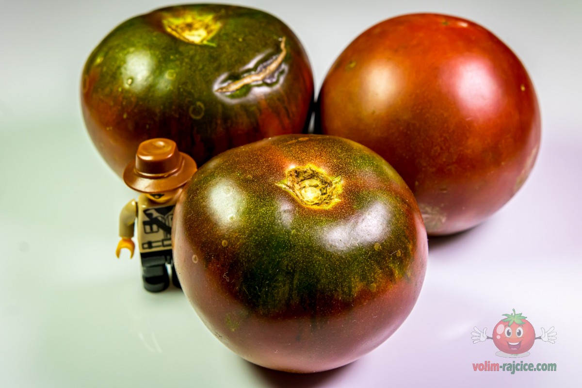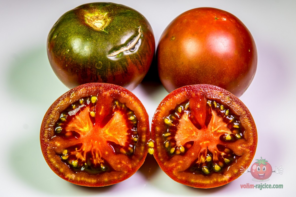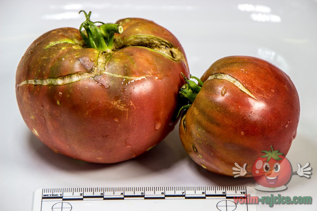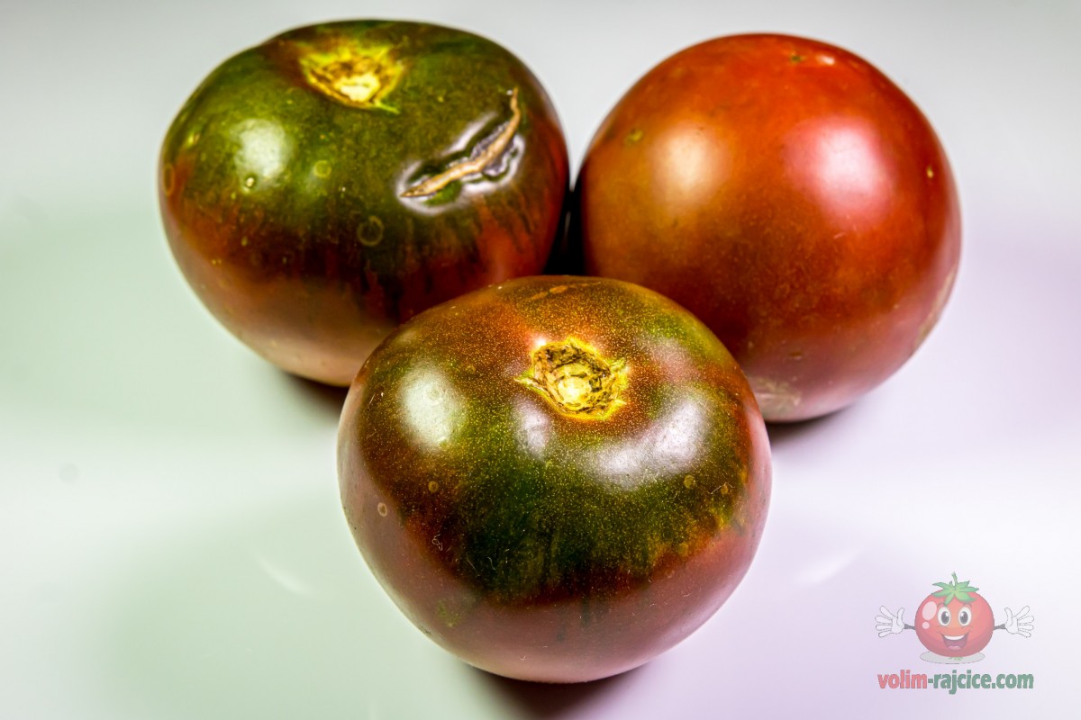 - Izgled: Plodovi su srednje veličine, tipično teški između 200 i 300 grama. Imaju onaj karakteristični izgled "crnih" rajčica – tamna tamnocrvena do čokoladno smeđa boja s izraženim, gotovo crnim ramena. Plodovi su blago spljošteni i rebrasti.