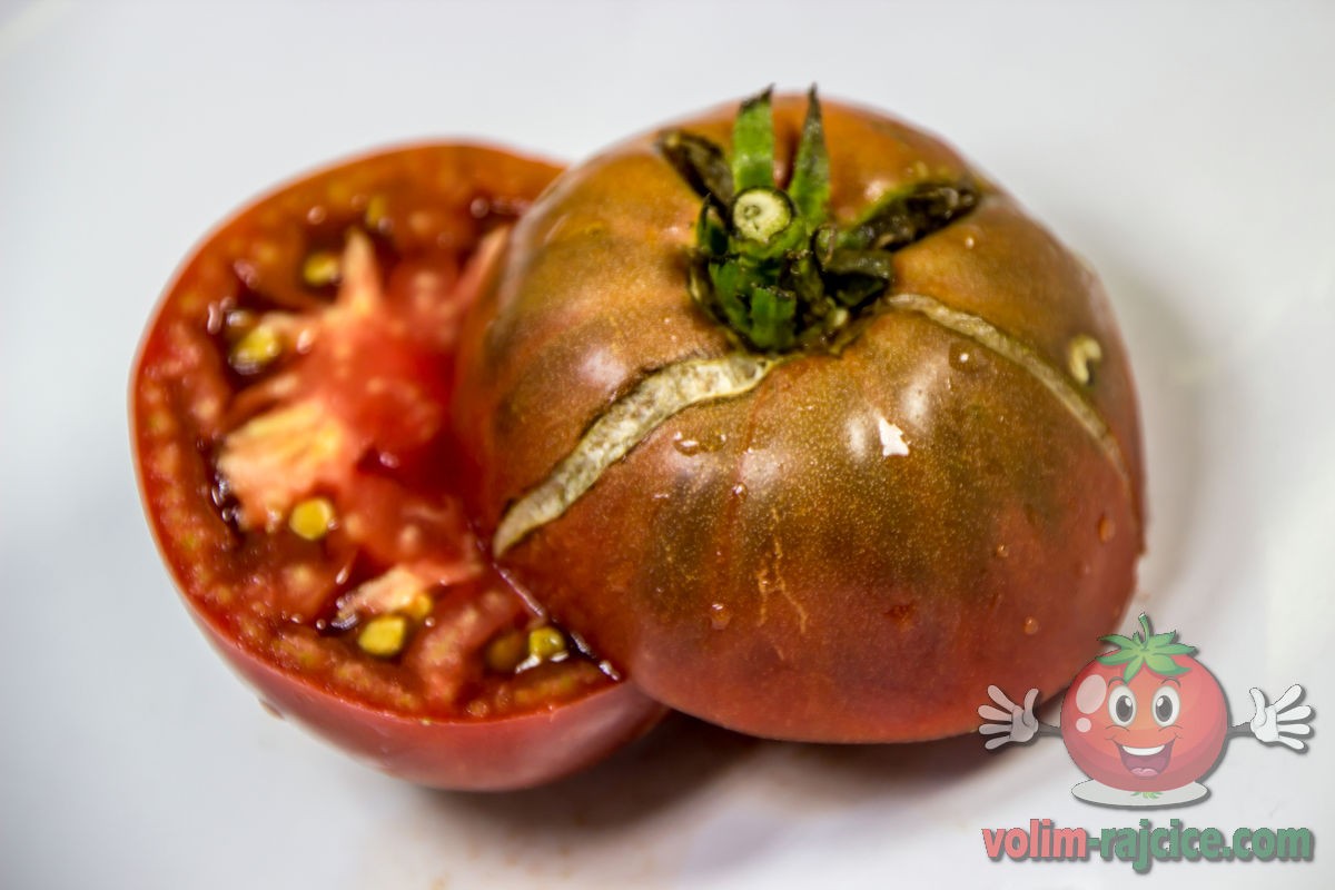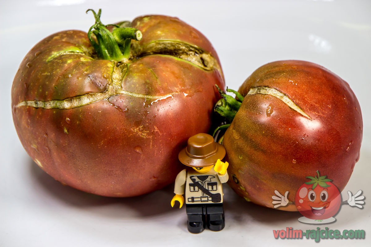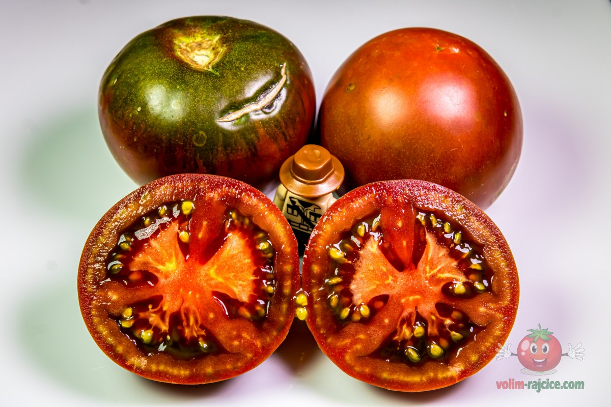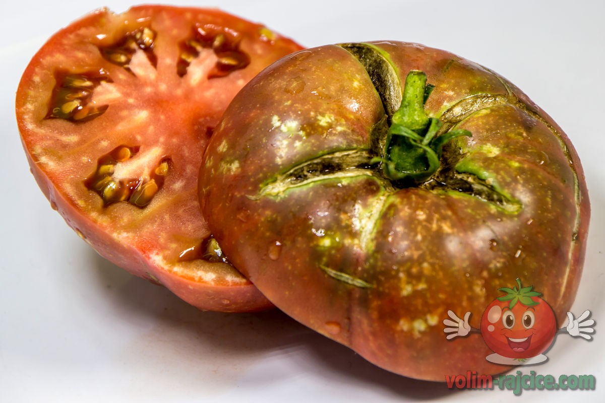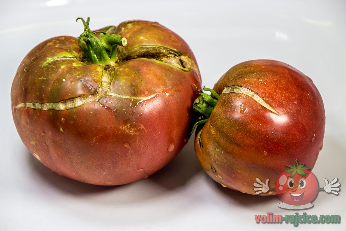 - Izgled: Plodovi su srednje veličine, tipično teški između 200 i 300 grama. Imaju onaj karakteristični izgled "crnih" rajčica – tamna tamnocrvena do čokoladno smeđa boja s izraženim, gotovo crnim ramena. Plodovi su blago spljošteni i rebrasti.