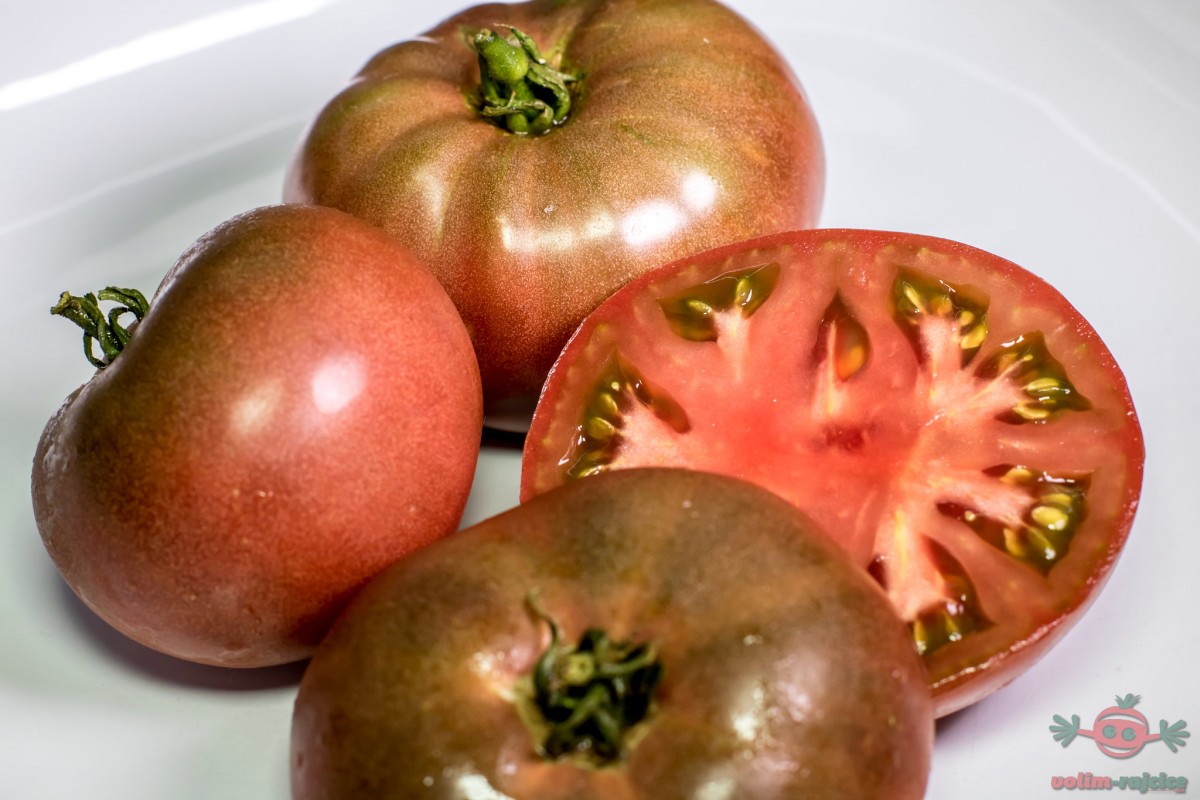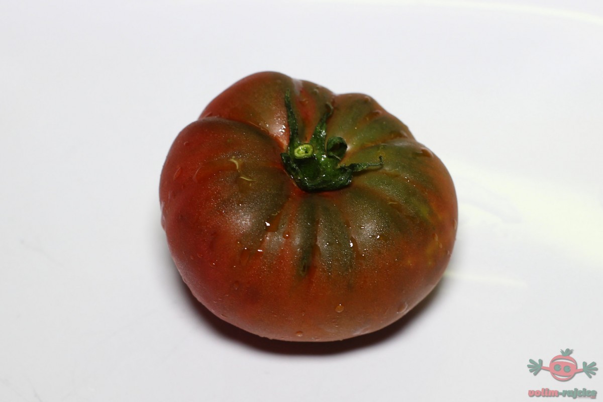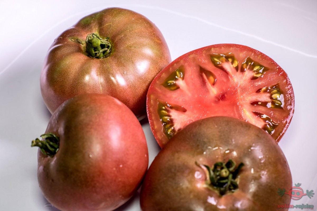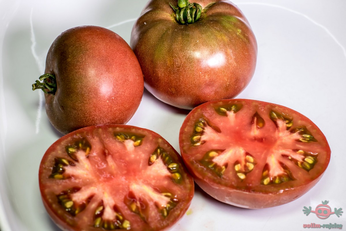 - Izgled: Plodovi su krupni, tipa beefsteak, težine od 300 do 500 grama. Boja je jedinstvena i dramatična: tamna, zagasito roza-ljubičasta s tamnozelenim "ramenima" koja ostaju zelena čak i kada je plod potpuno zreo. Unutrašnjost je tamno crvena, gotovo boje krvi.