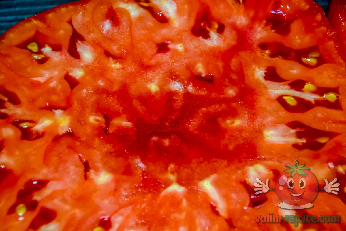 Okusom je odlična - intenzivan okus rajčice - odlična kombinacija kiseline i slatkoće - vrlo intenzivno, vrlo ujednačeno. Onaj pravi starinski okus, prava starinska rajčica. I mesnata i sočna istovremeno, što nije čest slučaj za ovako veliku mesnatu rajčicu. Iako je 2018. godina bila s puno vremenskih promjena i s puno vrelih dana - odlično se držala. Okusom doista spada u top nekoliko crvenih sorti i planiram ju uzgajati svake godine.