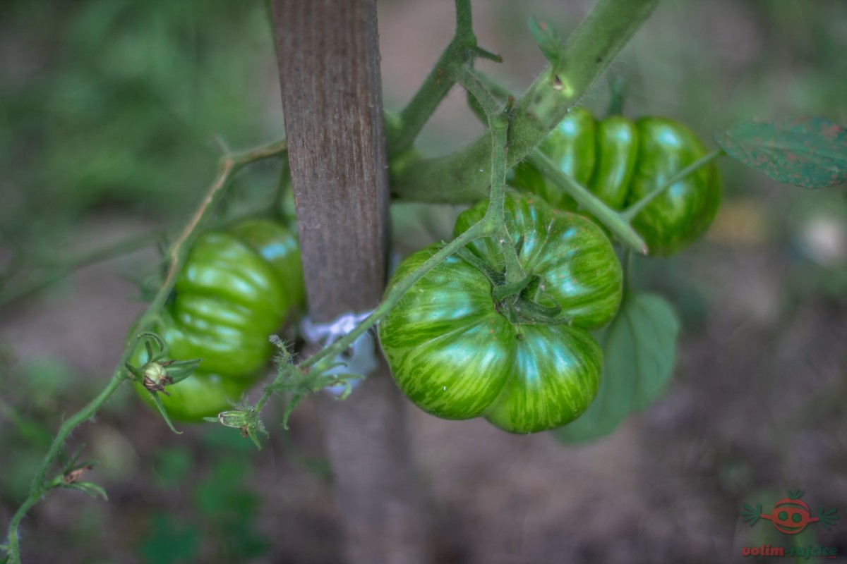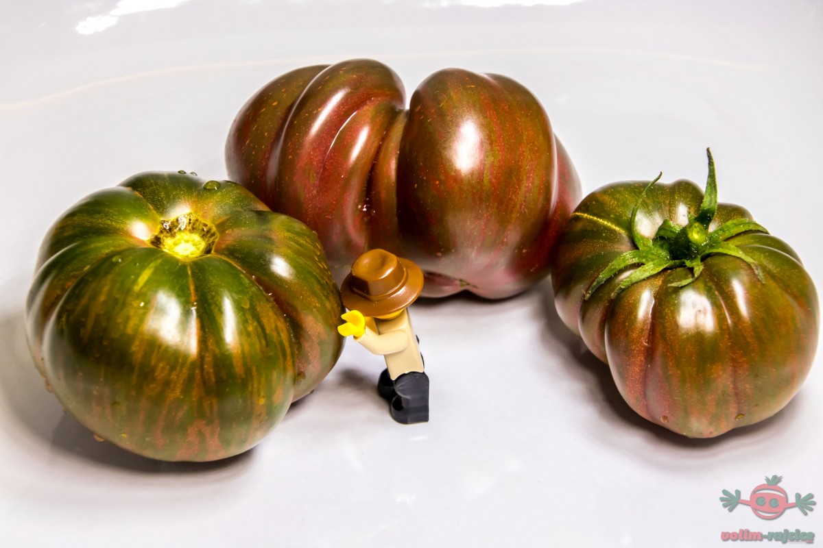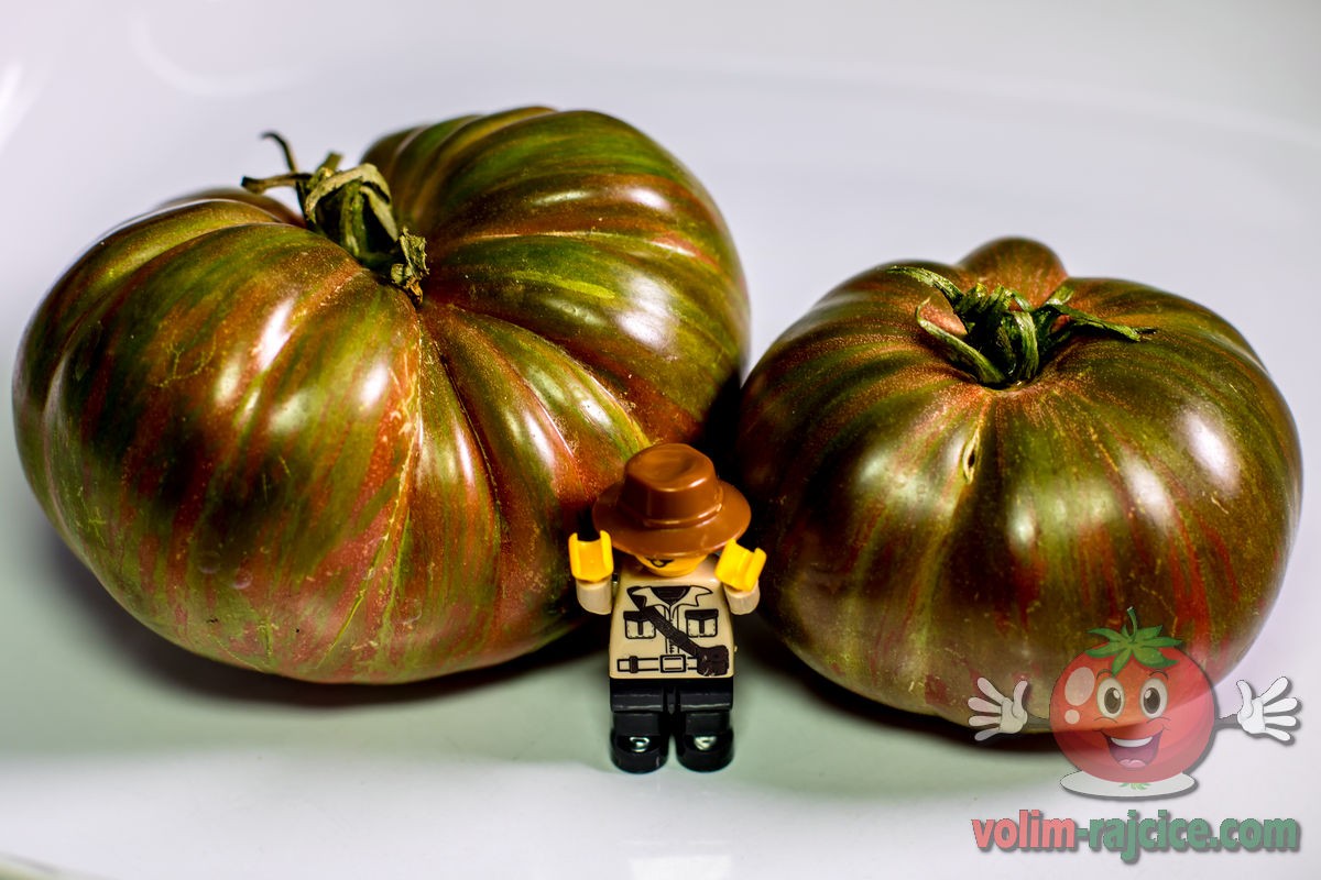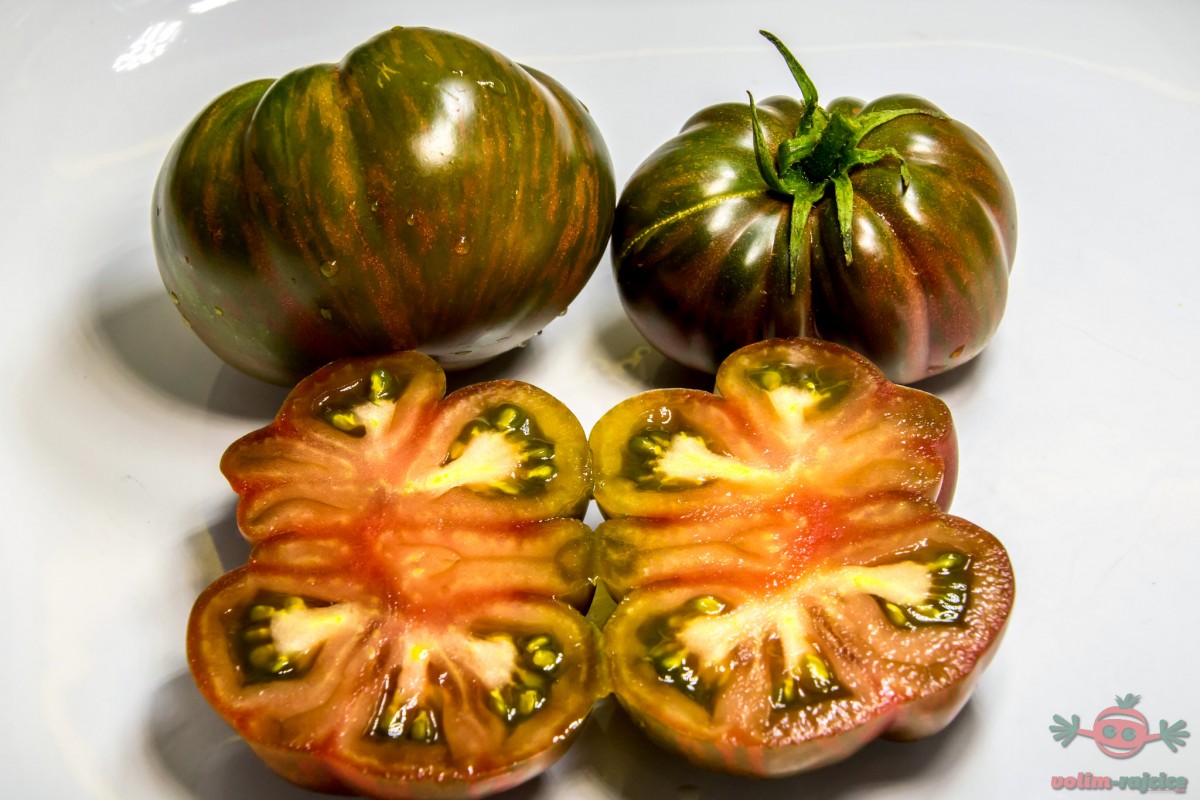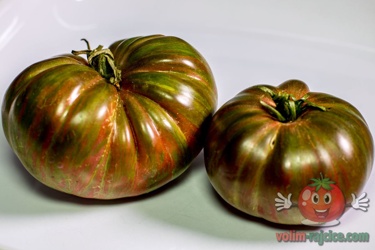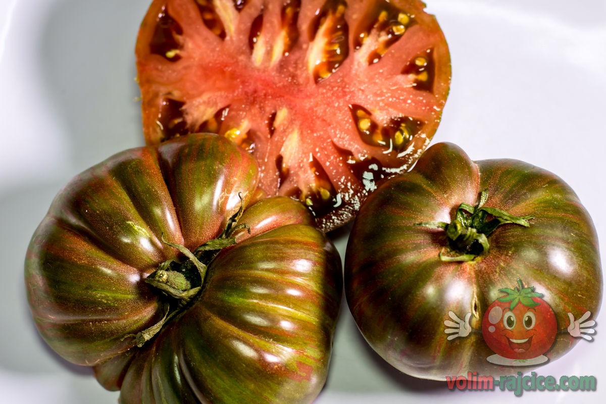 - Izgled: Plodovi su tipa beefsteak, srednje veličine, obično teški između 250 i 400 grama. Izvana su pravo umjetničko djelo: tamna, vinski-ružičasta podloga prekrivena je iridescentnim metalik-zelenim prugama. Unutrašnjost je vibrantna, tamno crvena s ružičastim i ponekad žućkastim šarama.